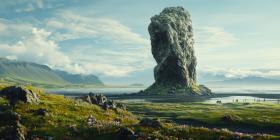 Serene Seascape: A Dramatic Rock Formation Stands Tall by a Tranquil Lake