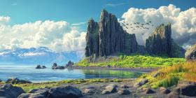 Serene Seascape: A Dramatic Rock Formation Stands Tall by a Tranquil Lake