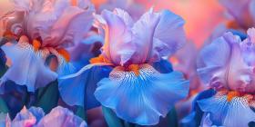 A Symphony of Colors: Irises Dance in the Warm Glow of Sunset, Their Petals a Tapestry of Vivid Hues.