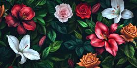 A Nocturnal Bloom: A Lush Tapestry of Roses and Lilies, Bathed in Moonlight, Unfurls Against a Velvet Night Sky.