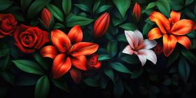 A Nocturnal Bloom: A Lush Tapestry of Roses and Lilies, Bathed in Moonlight, Unfurls Against a Velvet Night Sky.
