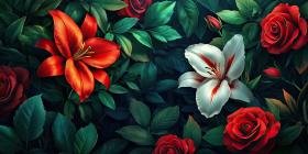 A Nocturnal Bloom: A Lush Tapestry of Roses and Lilies, Bathed in Moonlight, Unfurls Against a Velvet Night Sky.