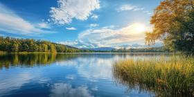 Tranquil Waterscape: A Serene Lake Reflects the Sky and Surrounding Hills