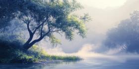 Golden Hour on the River: Sunlight pierces the morning mist, illuminating a tranquil river winding through a lush green forest, creating a scene of ethereal beauty.