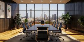 Panoramic Perspective: A sleek boardroom offers breathtaking views of the city skyline, inspiring innovation and collaboration.