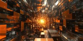 A Digital Odyssey: A journey through a mesmerizing network of glowing cubes, where technology and art converge in a dazzling display of light and form.