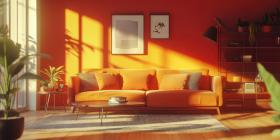 Warmth and Vibrancy: A sun-drenched living room, bathed in a warm orange glow, invites relaxation and a sense of cheerful energy.