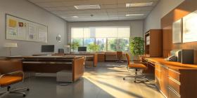 Daybreak at the Office: Sunlight streams through large windows, illuminating a modern workspace ready for the day's challenges, with cityscapes providing a vibrant backdrop.