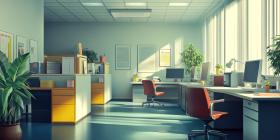 Daybreak at the Office: Sunlight streams through large windows, illuminating a modern workspace ready for the day's challenges, with cityscapes providing a vibrant backdrop.