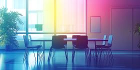Meeting in the Spectrum: A modern meeting room bathed in a vibrant spectrum of color, inviting collaboration and creativity.