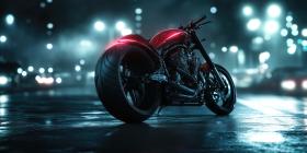 Chrome Dreams: A custom-built motorcycle gleams under a neon glow, a symbol of power, rebellion, and the open road.