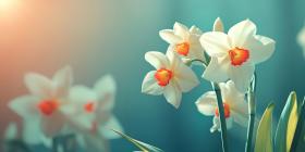 Nocturnal Bloom: Delicate daffodils, illuminated by a string of distant lights, stand tall amidst a tranquil pond, their reflections shimmering on the water's surface.