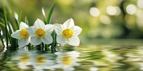 Nocturnal Bloom: Delicate daffodils, illuminated by a string of distant lights, stand tall amidst a tranquil pond, their reflections shimmering on the water's surface.