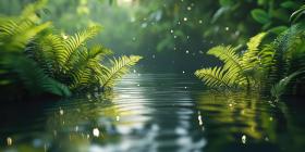 A Verdant Awakening: Raindrops dance on the surface of a tranquil stream, awakening a lush landscape to a new day, where life thrives amidst the vibrant green hues.