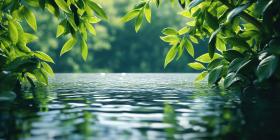 A Verdant Awakening: Raindrops dance on the surface of a tranquil stream, awakening a lush landscape to a new day, where life thrives amidst the vibrant green hues.