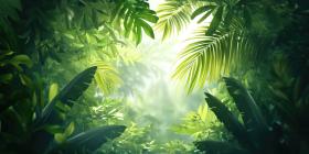 Sunlight Through the Jungle: A beam of sunlight pierces the dense foliage of a tropical jungle, illuminating a vibrant tapestry of green leaves and casting dappled shadows on the forest floor.
