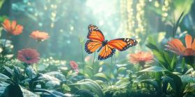 Flight of Fancy: A vibrant monarch butterfly flutters amongst a bed of colorful blooms, its wings catching the sunlight as it embarks on a journey through a sun-dappled garden.