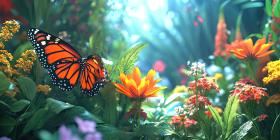 Flight of Fancy: A vibrant monarch butterfly flutters amongst a bed of colorful blooms, its wings catching the sunlight as it embarks on a journey through a sun-dappled garden.