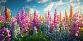 A Tapestry of Blooms: A vibrant field of flowers basks in the warm sunlight, where lilies of various hues stand tall, creating a breathtaking natural spectacle.
