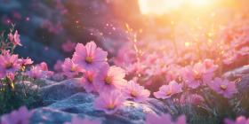 A Field of Dreams: Delicate pink cosmos sway gently in the warm sunlight, their petals catching the light like tiny jewels, creating a scene of enchanting beauty.