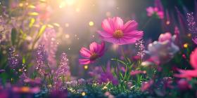 A Field of Dreams: Delicate pink cosmos sway gently in the warm sunlight, their petals catching the light like tiny jewels, creating a scene of enchanting beauty.
