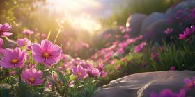 A Field of Dreams: Delicate pink cosmos sway gently in the warm sunlight, their petals catching the light like tiny jewels, creating a scene of enchanting beauty.