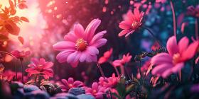 A Field of Dreams: Delicate pink cosmos sway gently in the warm sunlight, their petals catching the light like tiny jewels, creating a scene of enchanting beauty.
