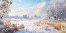Winter's Embrace: A serene winter landscape unfolds, where snow-covered trees line a tranquil river, reflecting the soft hues of a pastel sky.