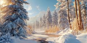 Winter's Embrace: A serene winter landscape unfolds, where snow-covered trees line a tranquil river, reflecting the soft hues of a pastel sky.