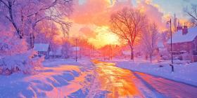 Winter's Embrace: A serene winter landscape unfolds, where snow-covered trees line a tranquil river, reflecting the soft hues of a pastel sky.