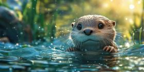 Curious Encounter: A curious otter pops its head above the water, eyes gleaming with intelligence, as a majestic mountain range forms a breathtaking backdrop.