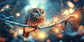 Winter's Watch: A curious owl, perched on a snow-laden branch, surveys the twinkling lights of a festive scene, its large eyes gleaming in the twilight.