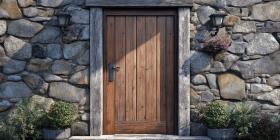 A Rustic Welcome: A weathered wooden door, framed by a stone wall, invites you into a cozy haven, promising warmth and tranquility within.
