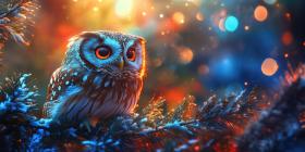 Winter's Watch: A curious owl, perched on a snow-laden branch, surveys the twinkling lights of a festive scene, its large eyes gleaming in the twilight.