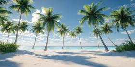 Paradise Found: A pristine beach, fringed with swaying palm trees, beckons beneath a sky of azure blue, promising a perfect escape to tranquility.