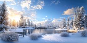 Winter's Embrace: A serene park, blanketed in snow, invites quiet contemplation beside a tranquil lake, where the air is crisp and the world feels hushed.