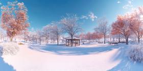 Winter's Embrace: A serene park, blanketed in snow, invites quiet contemplation beside a tranquil lake, where the air is crisp and the world feels hushed.