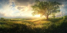 Golden Hour Serenity: A majestic oak tree stands sentinel in a sun-drenched meadow, casting long shadows as the sun dips below the horizon, painting the sky with vibrant hues.