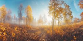Misty Morning Magic: A sunbeam pierces the fog, illuminating a mystical forest where autumn leaves paint the landscape in shades of gold and amber.