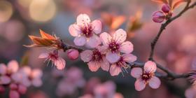 A Prelude to Spring: Delicate pink blossoms burst forth, heralding the arrival of warmer days, as the sun casts a warm glow on the budding branches.