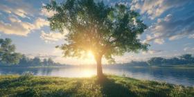 Golden Hour Serenity: A majestic oak tree stands sentinel in a sun-drenched meadow, casting long shadows as the sun dips below the horizon, painting the sky with vibrant hues.