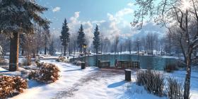 Winter's Embrace: A serene park, blanketed in snow, invites quiet contemplation beside a tranquil lake, where the air is crisp and the world feels hushed.