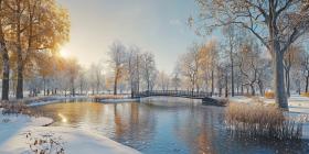 Winter's Embrace: A serene park, blanketed in snow, invites quiet contemplation beside a tranquil lake, where the air is crisp and the world feels hushed.