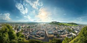 A panoramic vista unfolds, showcasing the city's charming architecture nestled amidst rolling hills, all under a sky painted with fluffy clouds.