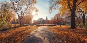 Autumnal Reverie: A path winds through a park bathed in golden sunlight, where fallen leaves create a carpet of color underfoot, and the city skyline peeks through the vibrant foliage.