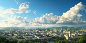 A panoramic vista unfolds, showcasing the city's charming architecture nestled amidst rolling hills, all under a sky painted with fluffy clouds.