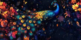 A peacock, resplendent in iridescent plumage, displays a breathtaking array of colors, creating a dazzling spectacle against a backdrop of vibrant lights.