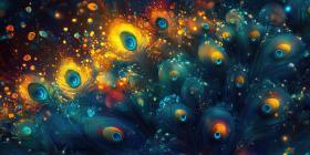 A peacock, resplendent in iridescent plumage, displays a breathtaking array of colors, creating a dazzling spectacle against a backdrop of vibrant lights.
