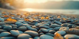 Sunset Stones: Smooth pebbles bask in the warm glow of the setting sun, casting long shadows along a tranquil shoreline, where autumn leaves have settled like fallen stars.