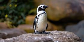 A curious penguin stands tall on a rocky perch, its tuxedo-like plumage contrasting against the lush greenery, ready for its next adventure
